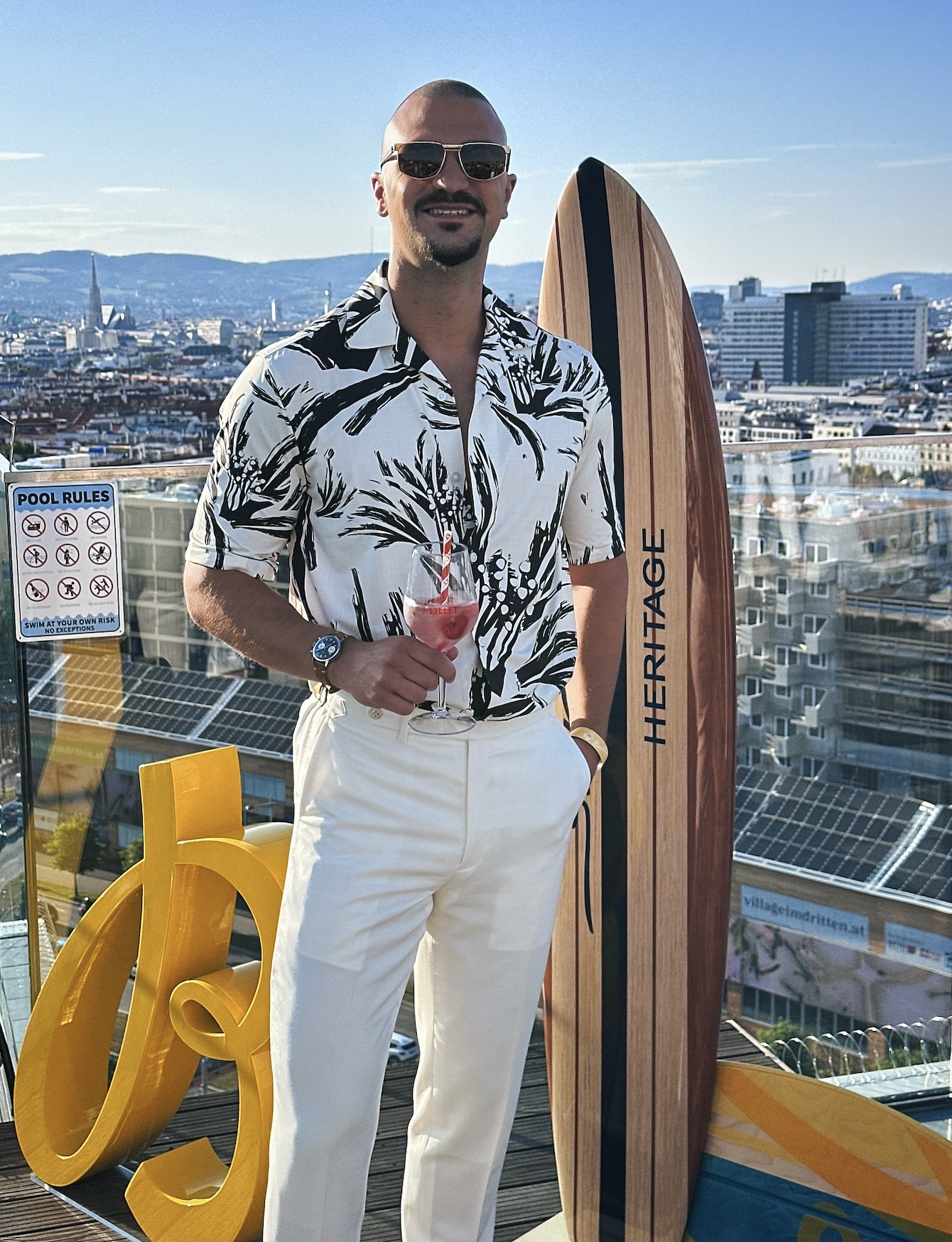 Do Beča se stiže veoma brzo, avionom za 50 minuta. Kasniji jutarnji let i eto nas u Beču pre podneva. Događaj je počeo u 18:30h što mi je ostavilo vremena da prošetam ovim prelepim gradom i da se spremim za večernju idilu. Koktel, druženje, muzika i satovi bili su svi na jednom mestu i to na krovu Beča. Bukvalno na krovu hotela sa bazenom sa kojeg se pruža pogled na čitav Beč. Dress code je bio inspirisan Havajima te je moj outfit za tu priliku bio adekvatan.