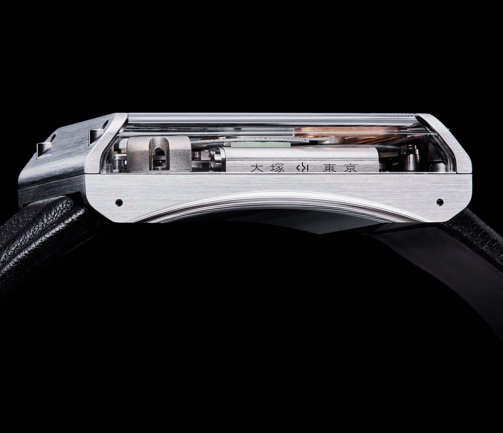 Kućište je od čelika, dimenzija 44 × 30 mm, sa staklom koje se proteže sa strane, što daje osećaj da je pokret glavna scena. Debljina doseže do 13 mm u najdebljoj tački, ali zakrivljena poleđina olakšava nošenje. Izgled je čist, industrijski, sa vidljivim šrafovima, vijcima i završnim obradama koje podsećaju na stare mašinske alate – ono što Katayama voli i čime se ističe