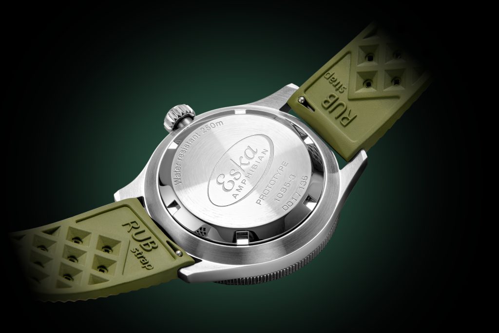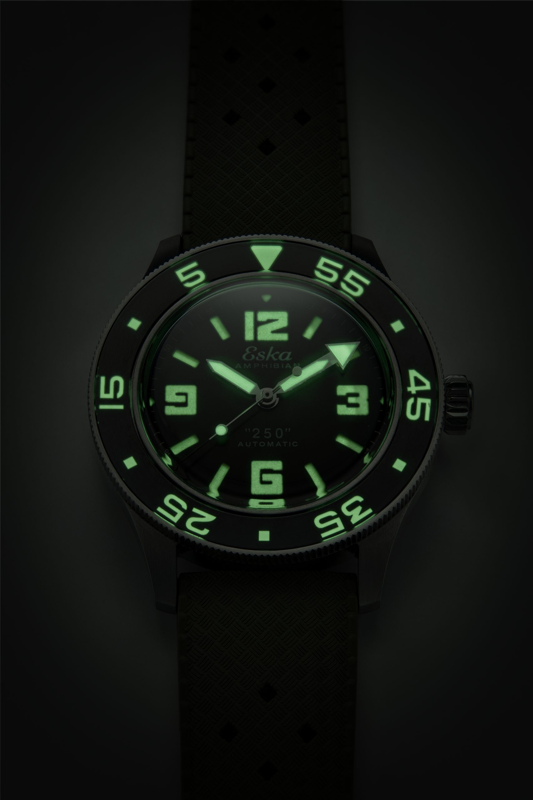 Prvi korak u pravcu lansiranja brenda od počtka bio je model Amphibian 250, kolekcija koja je momentalno osvojila publiku i najavila novo poglavlje u istoriji brenda. Osvojila je i moj zglob i dok pišem ovaj tekst sa hrvatskog Lastova na ruci nosim upravo ovaj ronilački sat. Upravo tim pravcem Eska sada nastavlja sa modelom Amphibian 250 Green Turtlelimitiranom serijom od 136 numerisanih primeraka.