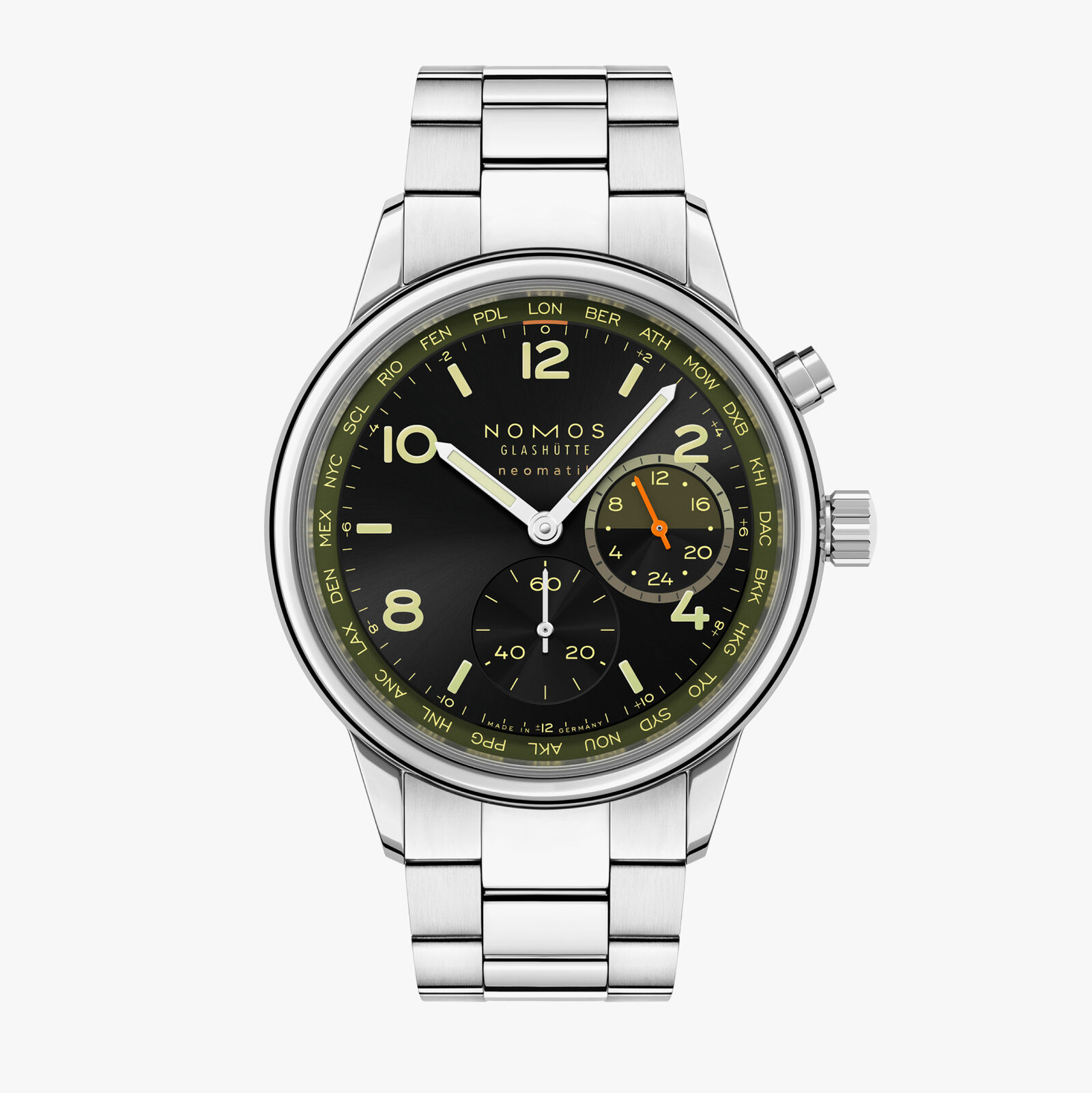 Kućište je prečnika 40 mm, izrađeno od nerđajućeg čelika, visine svega 9,9 mm, sa novim “shorter lug” dizajnom koji omogućava bolje prijanjanje na zglob. Vodootpornost je do 100 metara, a krunica ima bezbednosni obruč koji pokazuje crvenu traku tek kada se odvrne. Mali, ali značajan detalj. Unutra kuca novi in-house DUW 3202 automatski kalibar, sa komplikacijom Worldtimera, prikazom 24-časovnog kućnog vremena i rezervom snage od 42 sata, uz Nomosov Swing System balansni sklop.