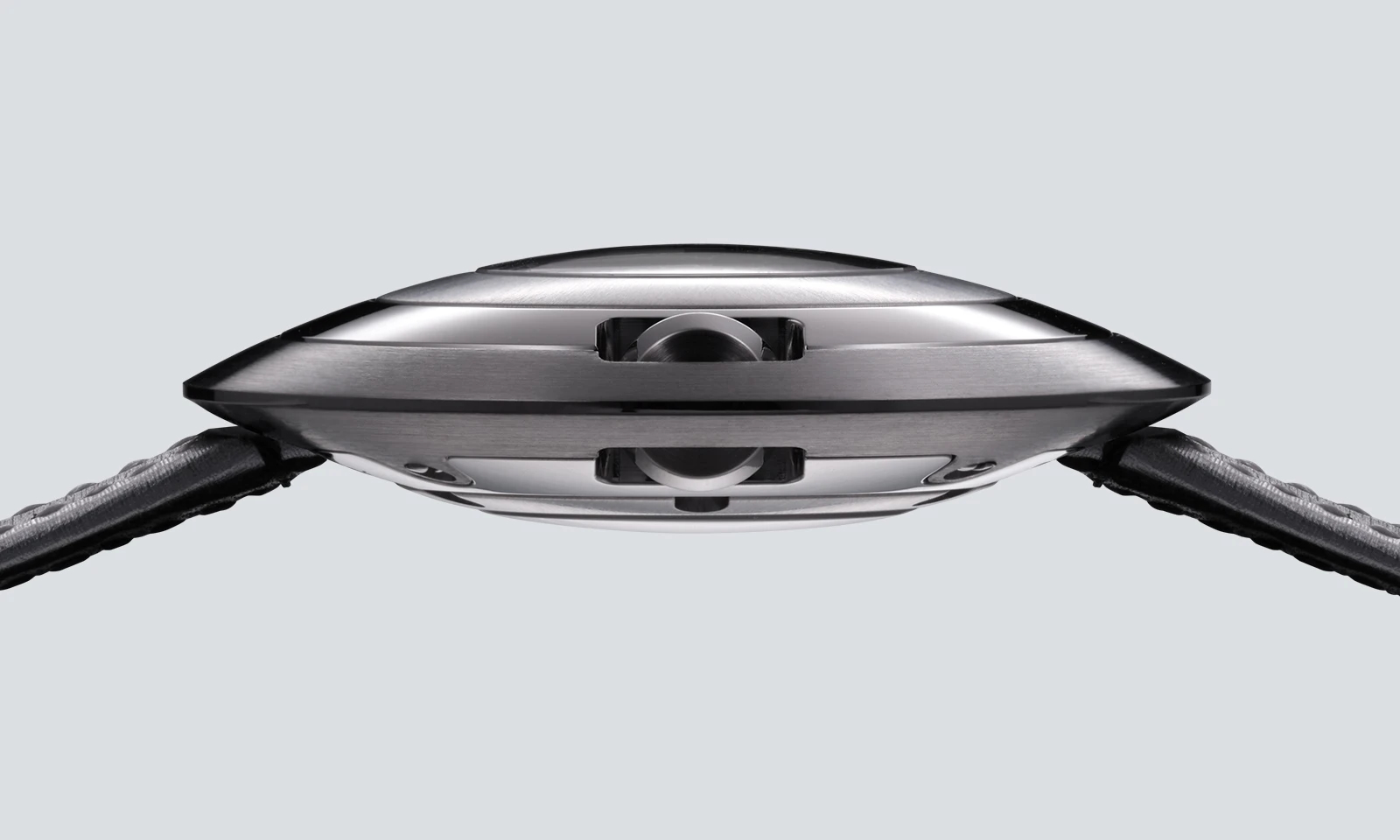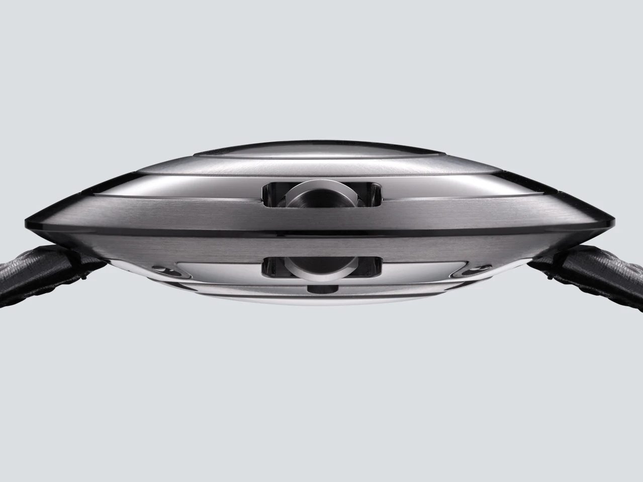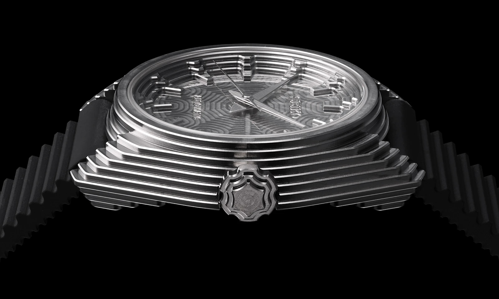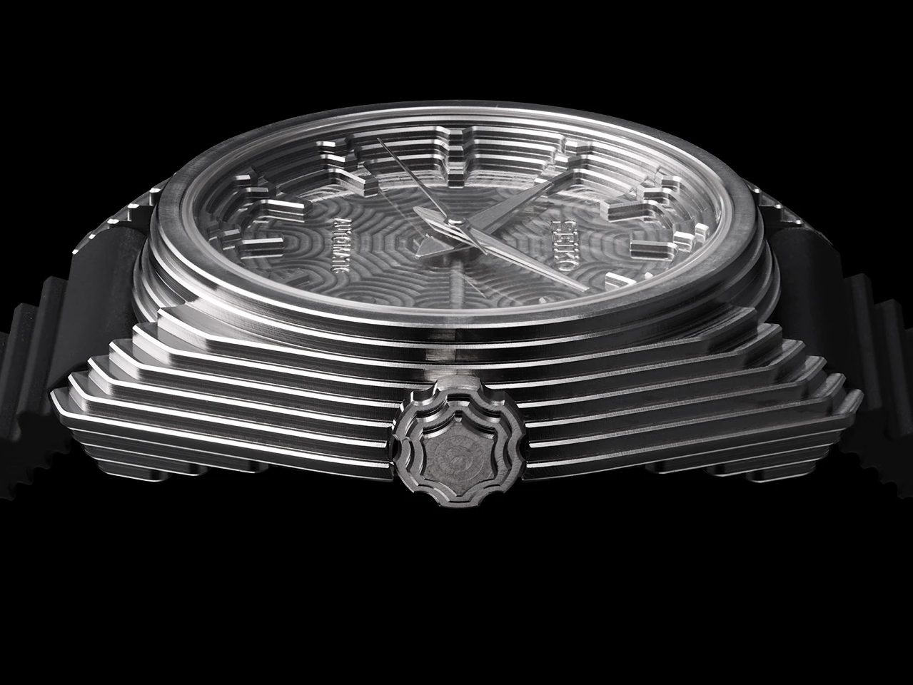Kod ovog modela kućište i brojčanik nisu posmatrani kao odvojeni elementi. Naprotiv, sat je oblikovan tako da djeluje kao da je nastao iz jednog komada metala, sa jasno naglašenim tragovima mašinske obrade koji se protežu kroz gotovo sve dijelove sata. Posebno su zanimljivi stepenasti prelazi i oštri nivoi na kućištu, krunici, kopči i drugim elementima, čime je vizuelni identitet “rezanja“ prenesen na cijeli časovnik.
