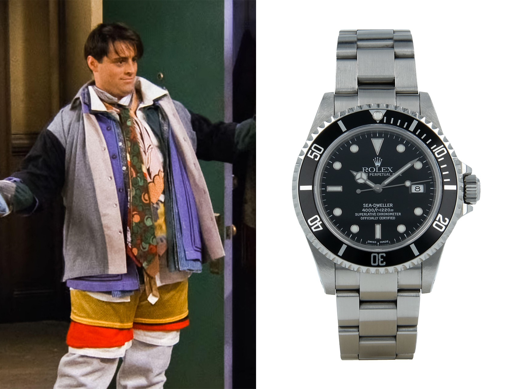 Joey Tribbiani, nezaobilazni ženskaroš i duhoviti član družine iz “Prijatelja”, često je bio bez ručnog sata na zglobu tokom serije. Međutim, nakon temeljnog pretraživanja, saznao sam da je Matt LeBlanc, glumac koji glumi lik Joeja, strastveni ljubitelj Rolex satova. U jednom intervjuu, LeBlanc je otkrio da je tokom 90-ih gotovo neprekidno nosio svoj Rolex Sea-Dweller, iako se zbog karakterističnih dukserica koje je Joey nosio na snimanju serije sat nije vidio pred kamerama. U to vrijeme, Matt LeBlanc je nosio Rolex Sea-Dweller 4000 referentne oznake 16600 koji se danas cijeni oko 12.000,00 EUR.