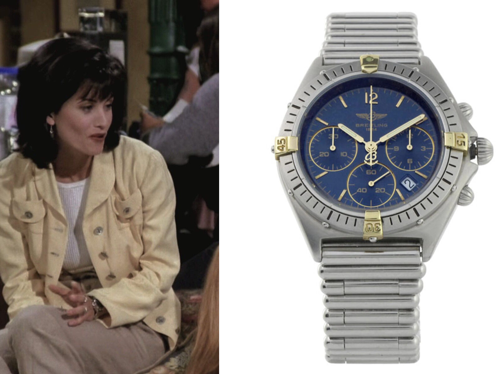 Monika Geller, simpatična kontrolna freak i majstorica u kuhinji, dodatno oplemenjuje dinamiku “Prijatelja”. Njene komične perfekcionističke tendencije i nezaboravni trenuci, poput “seven, seven, seven,” ostavljaju neizbrisiv pečat na humor serije. Kada je riječ o njenom stilu, Monika na svom zglobu nosi Breitling Sextant B55045 dimenzija 36mm sa kvarcnim mehanizmom. Ovaj izvanredni sat iz 90-ih izrađen je u two-tone izvedbi zlato-čelik sa plavim brojčanikom, dodajući sofisticiranu notu njenom karakteru. Trenutna cijena ovog modela varira od 1.000 do 1.500 EUR, zavisno o očuvanosti.
