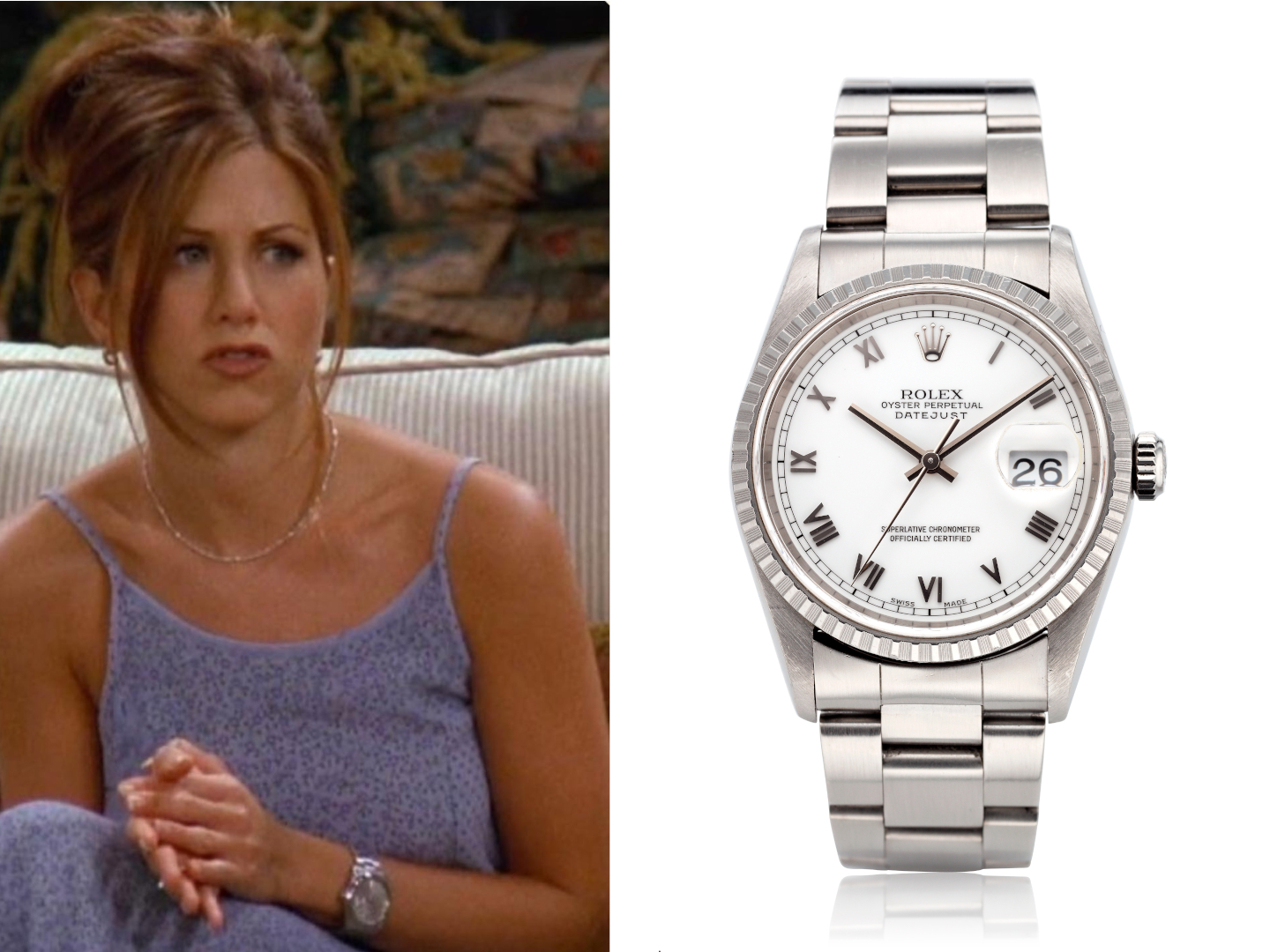 Rachel Green, nekadašnja modna kraljica i prodavačica u robnoj kući Bloomingdale’s, donosi sofisticiranu modnu notu “Prijateljima”. Na svom zglobu nosi Rolex Datejust s srebrno-bijelim “Roman Dial” brojčanikom na Oyster narukvici. Ovaj model potiče iz lične kolekcije Jennifer Aniston, koja je tokom godina postala ikona stila noseći desetine Rolex modela. Jennifer Aniston preferira dimenziju od 36mm, a u specijalnoj emisiji Friends Reunion iz 2021. godine viđena je s Rolex Day-Date modelom izrađenim u zlatu. Trenutna cijena Rolex Datejust Roman Dial modela, kakav Rachel nosi u “Prijateljima” kreće se oko 7.000 EUR.