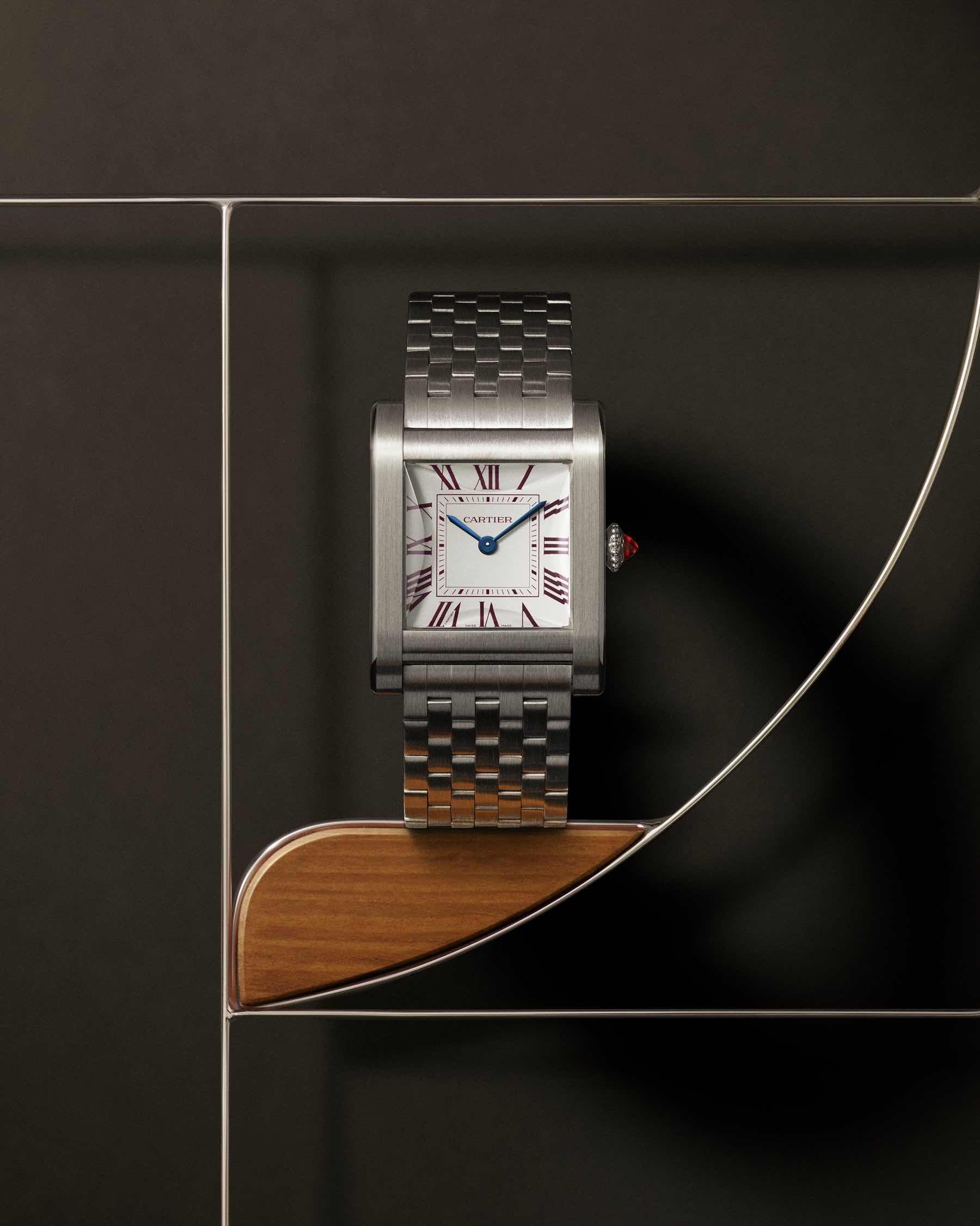 Još od 1934. godine, ovaj kompanijski dragulj, plijeni svojom oštrom estetikom, dizajnom koji odiše naslijeđem kompanije, sve zaključno sa predivnim rubinom koji upotpunjuje cjelokupni dojam ovog sata, čineći ga kompletnim izdankom Cartier-a. Kućište časovnika, ostaje nepromijenjeno, dok se diferentia specifica u odnosu na prethodne modele ogleda u izradi narukvice od platine, koja je kreirana u sedmorednom dizajnu.