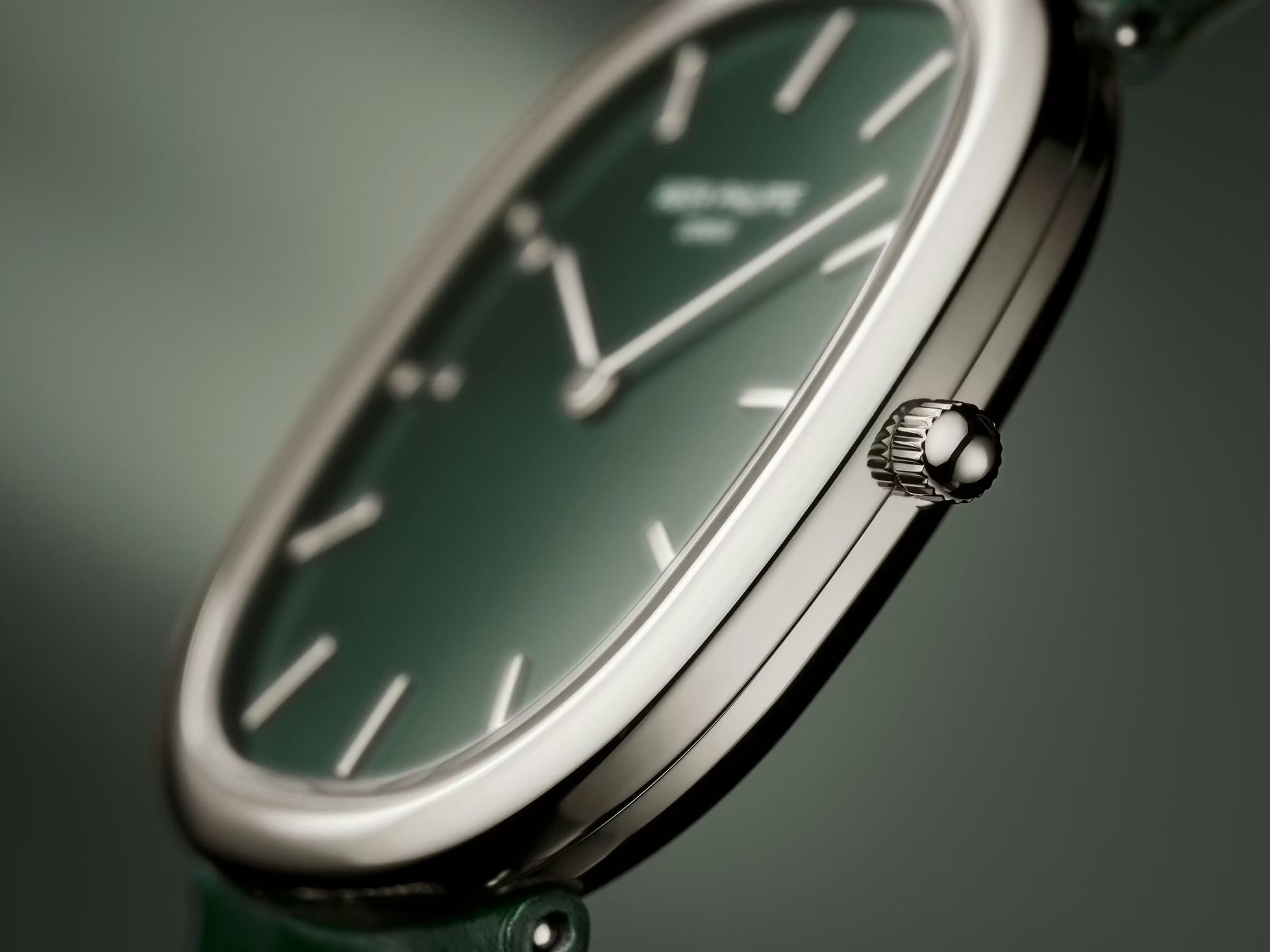 Posebno lijepo izgleda novi olive-green sunburst brojčanik, koji ovim satovima daje svježinu, ali bez narušavanja njihove klasične prirode. Nijansa zelene je dovoljno mirna i duboka da ne djeluje agresivno, već vrlo otmjeno i ozbiljno. U kombinaciji sa tankim bijelo-zlatnim baton markerima i uskim kazaljkama, cijeli brojčanik ostaje potpuno vjeran dugogodišnjem Golden Ellipse izrazu. Ono što takođe treba naglasiti jeste da oba modela ostaju izuzetno tanka, sa kućištem debljine svega 5,99 mm. To je važan dio njihovog karaktera, jer Golden Ellipse upravo kroz tu tankoću i profinjenost gradi svoju eleganciju na ruci.