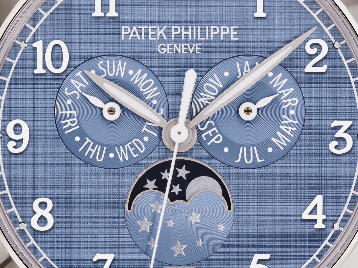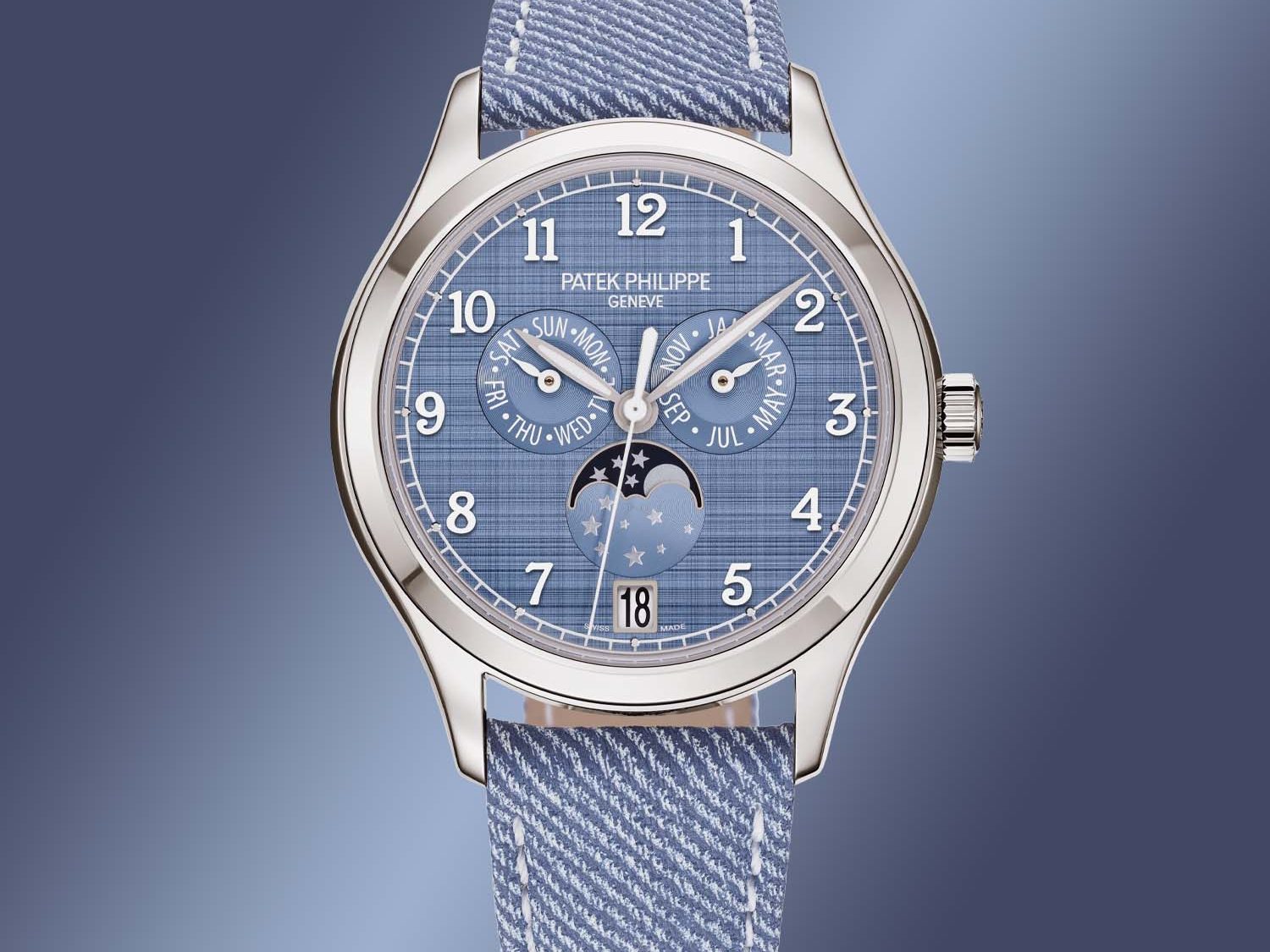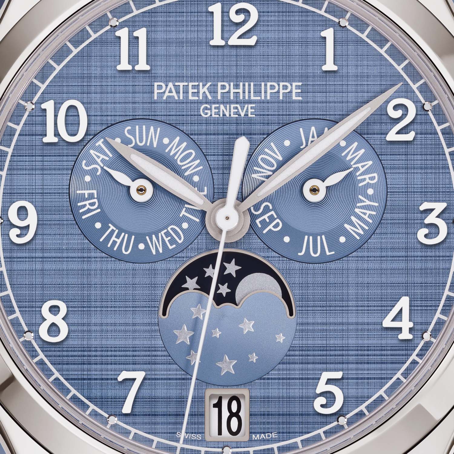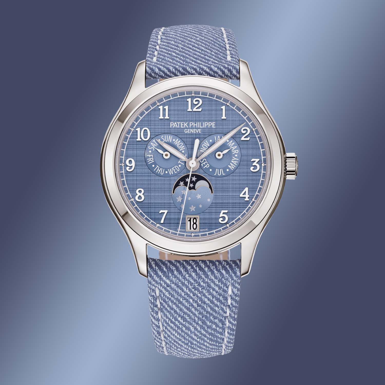 Drugi godišnji kalendar, ref. 4946G-001, ide u potpuno drugačijem pravcu. Ovdje Patek pravi komplikovani sat koji djeluje mnogo opuštenije i modernije. Kućište od bijelog zlata promjera 38 mm ostaje elegantno, ali brojčanik donosi sasvim drugačiju atmosferu. Plavo-sivi shantung finiš sa dvostrukim satiniranjem podsjeća na teksturu denima ili tkanine, a prvi put kod Pateka dobijamo i arapske brojeve sa luminiscentnim punjenjem izvedene kao monoblok elementi.