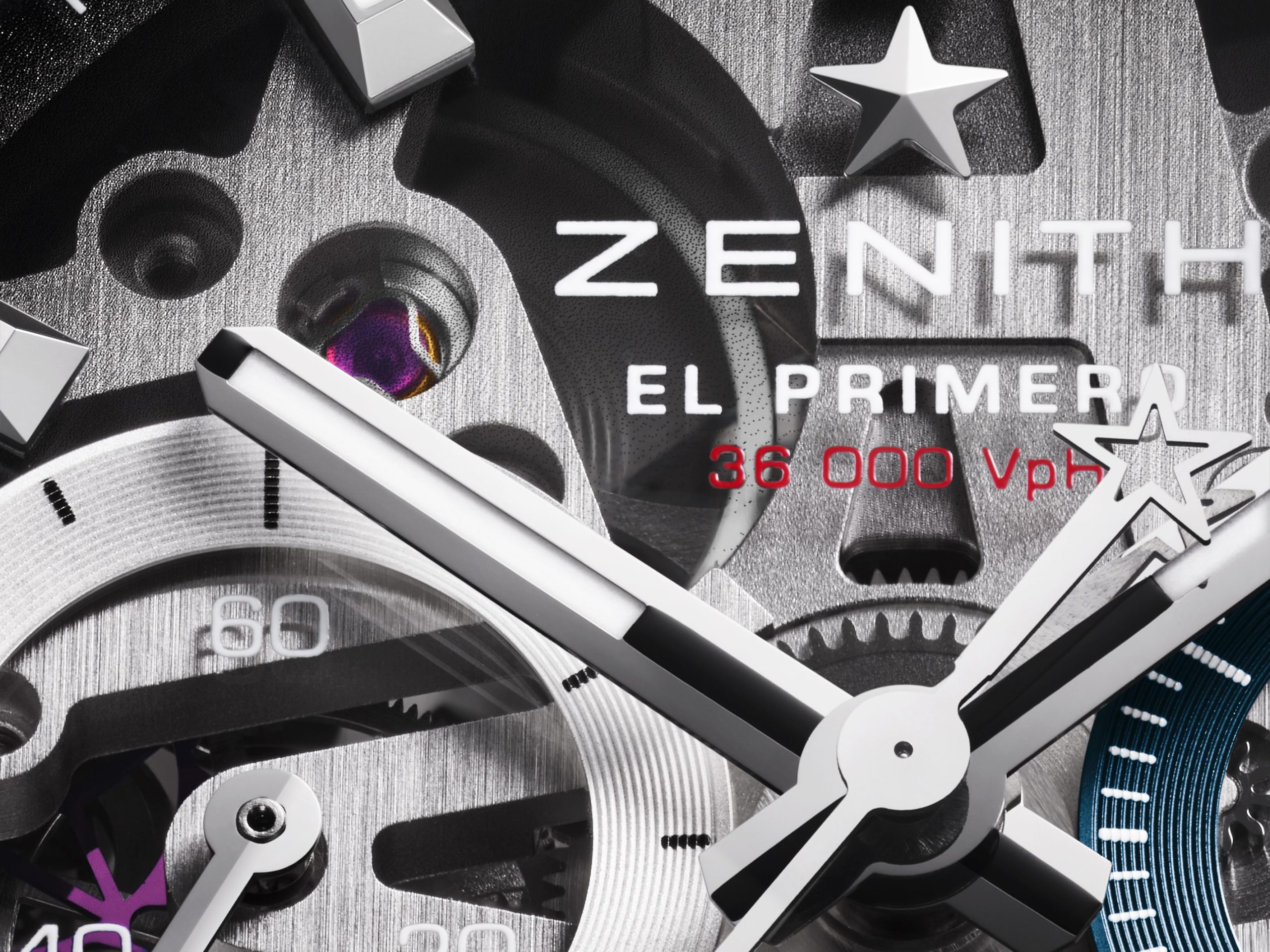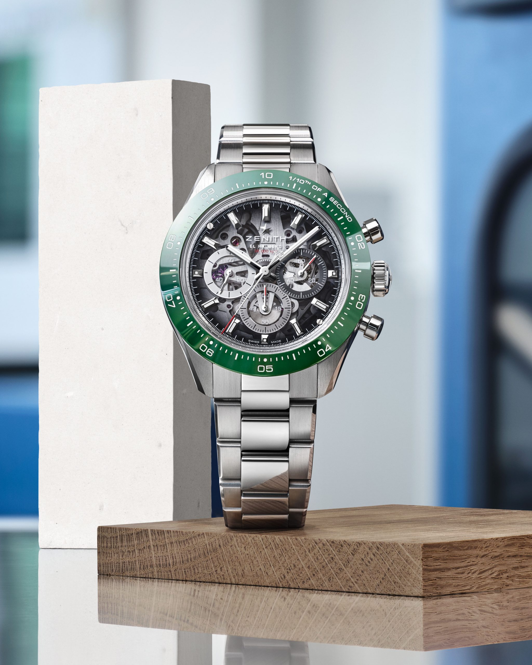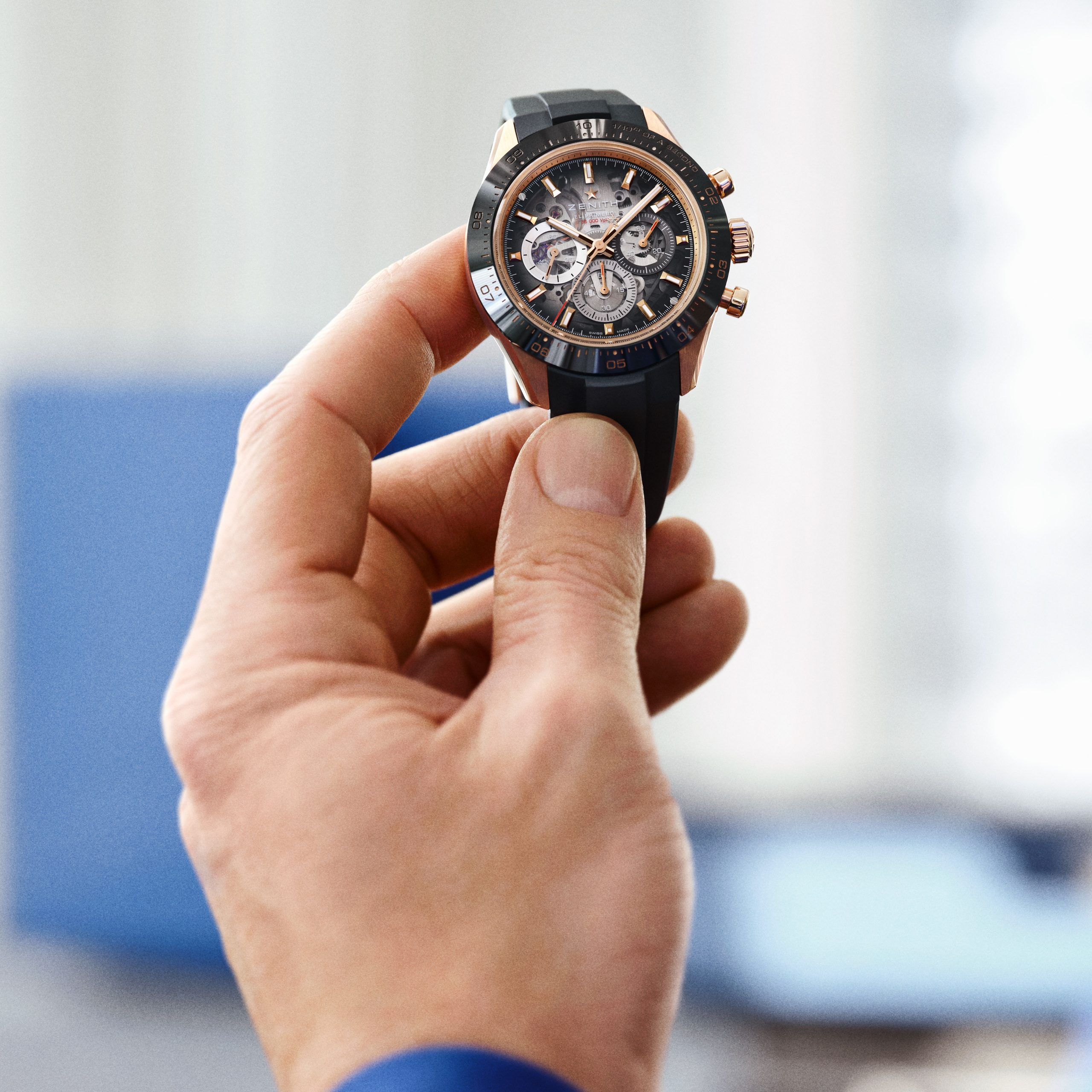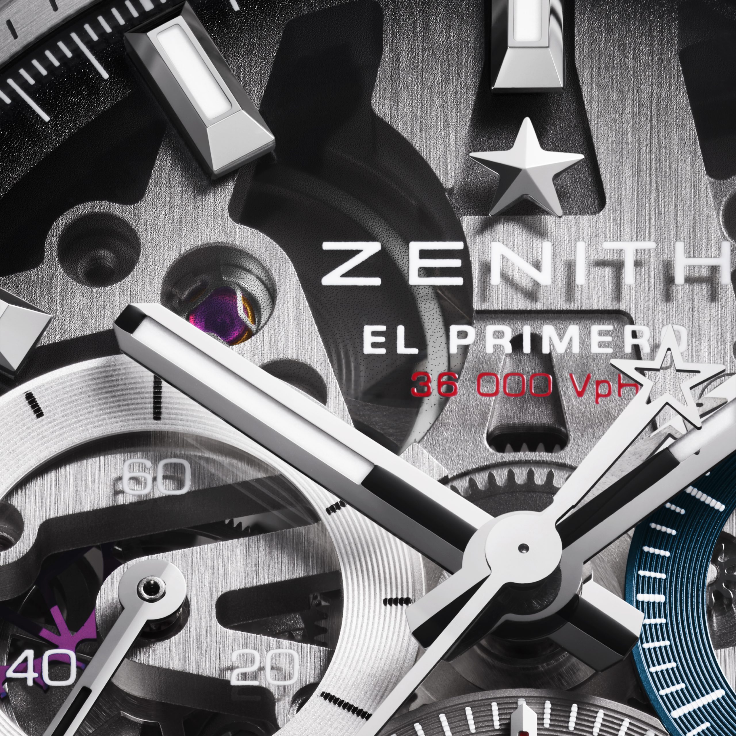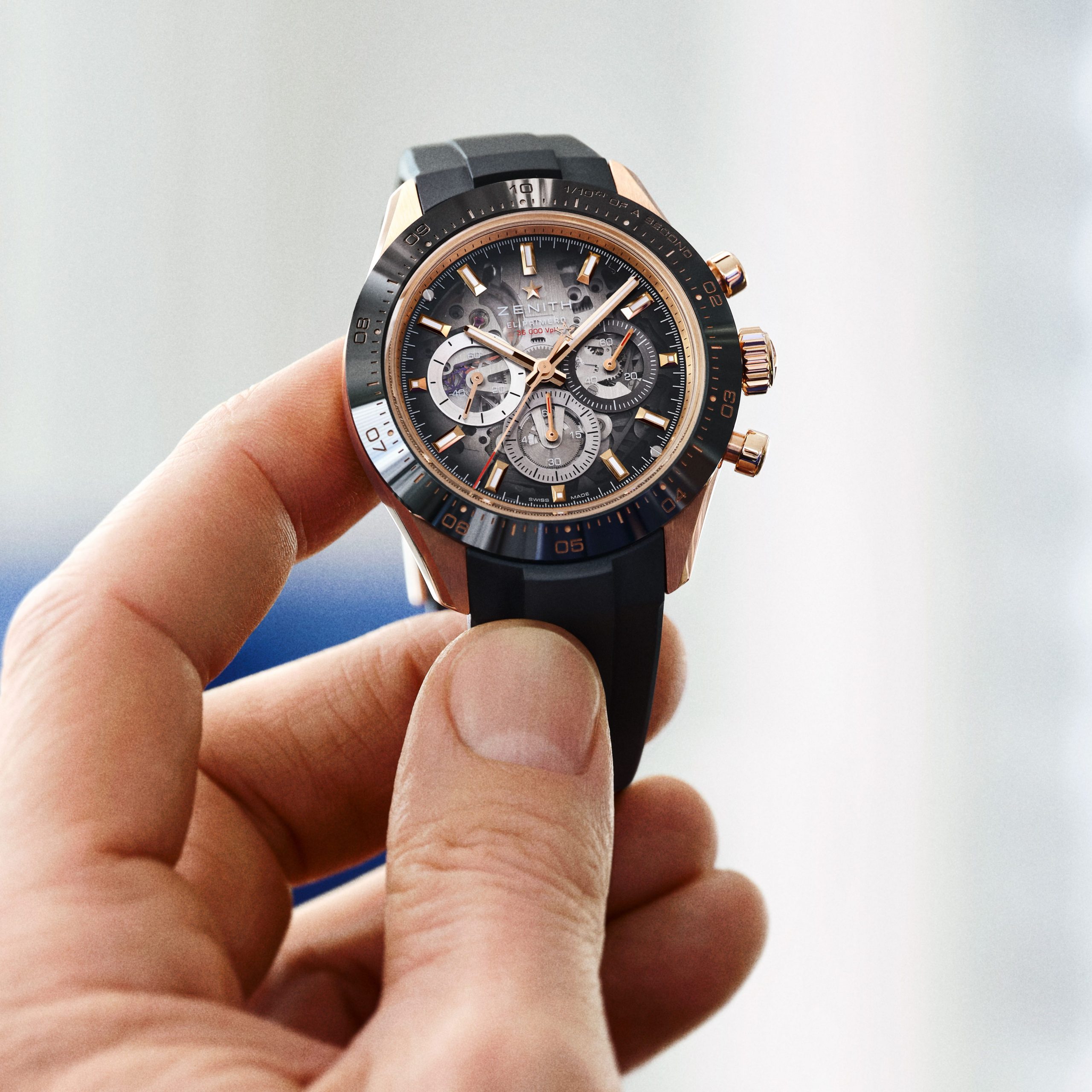 Podbrojčanici ostaju vjerni Zenith tradiciji i dolaze u prepoznatljivoj trobojnoj kombinaciji, sivoj, antracit i plavoj. Dodatno su naglašeni okvirima sa snail završnom obradom, što stvara odličan kontrast u odnosu na transparentni safirni brojčanik. Taj fini kružni uzorak unosi teksturu i dubinu, pa brojčanik djeluje veoma bogato, a pritom ostaje pregledan i sportski. Upravo taj spoj transparentnosti, boje i teksture čini ovaj model jednim od najzanimljivijih Zenith noviteta na sajmu.