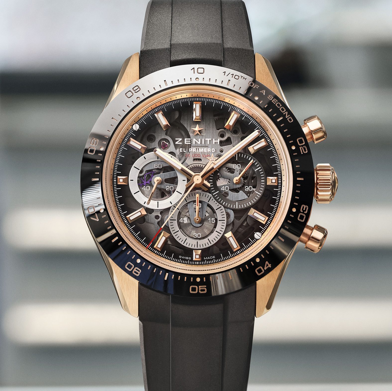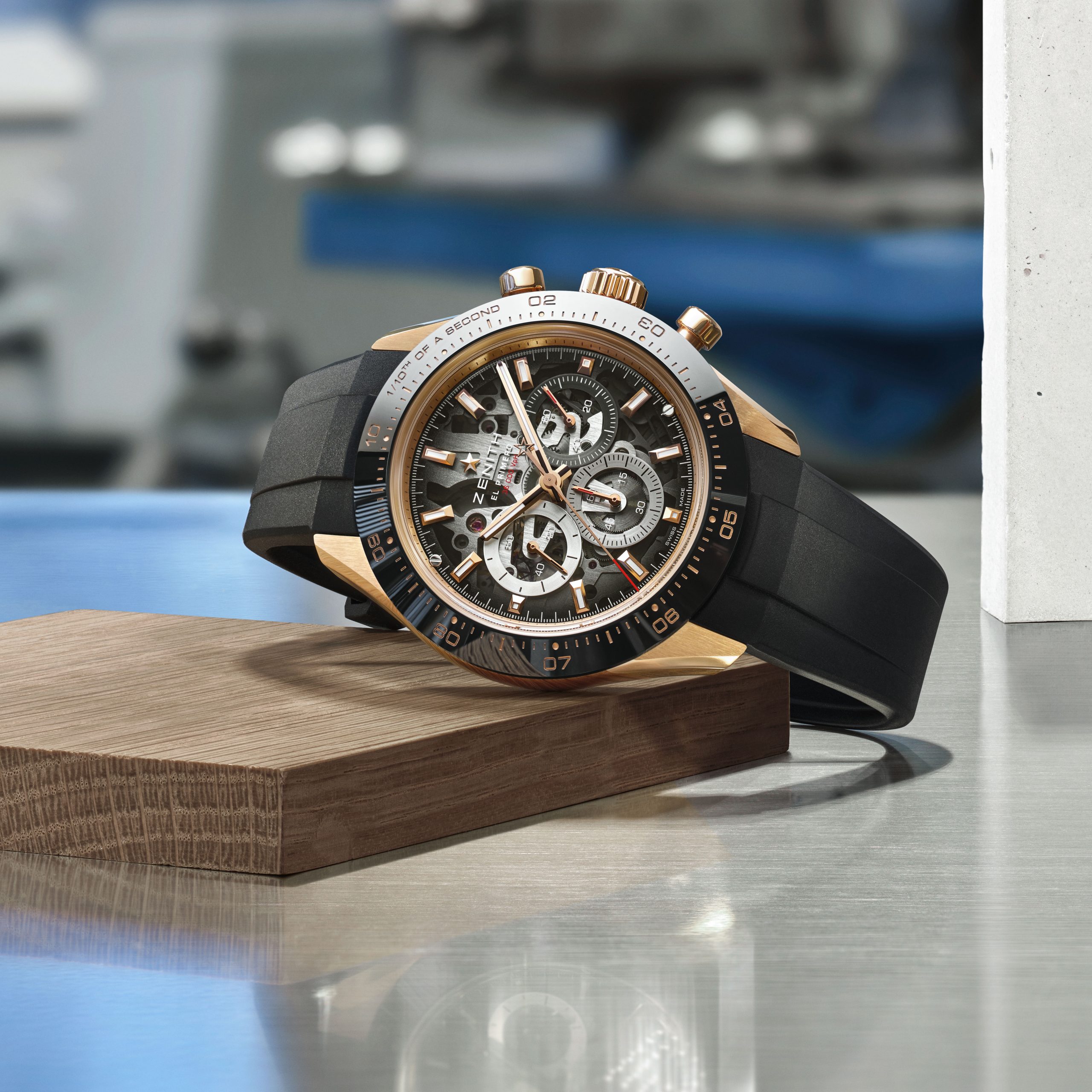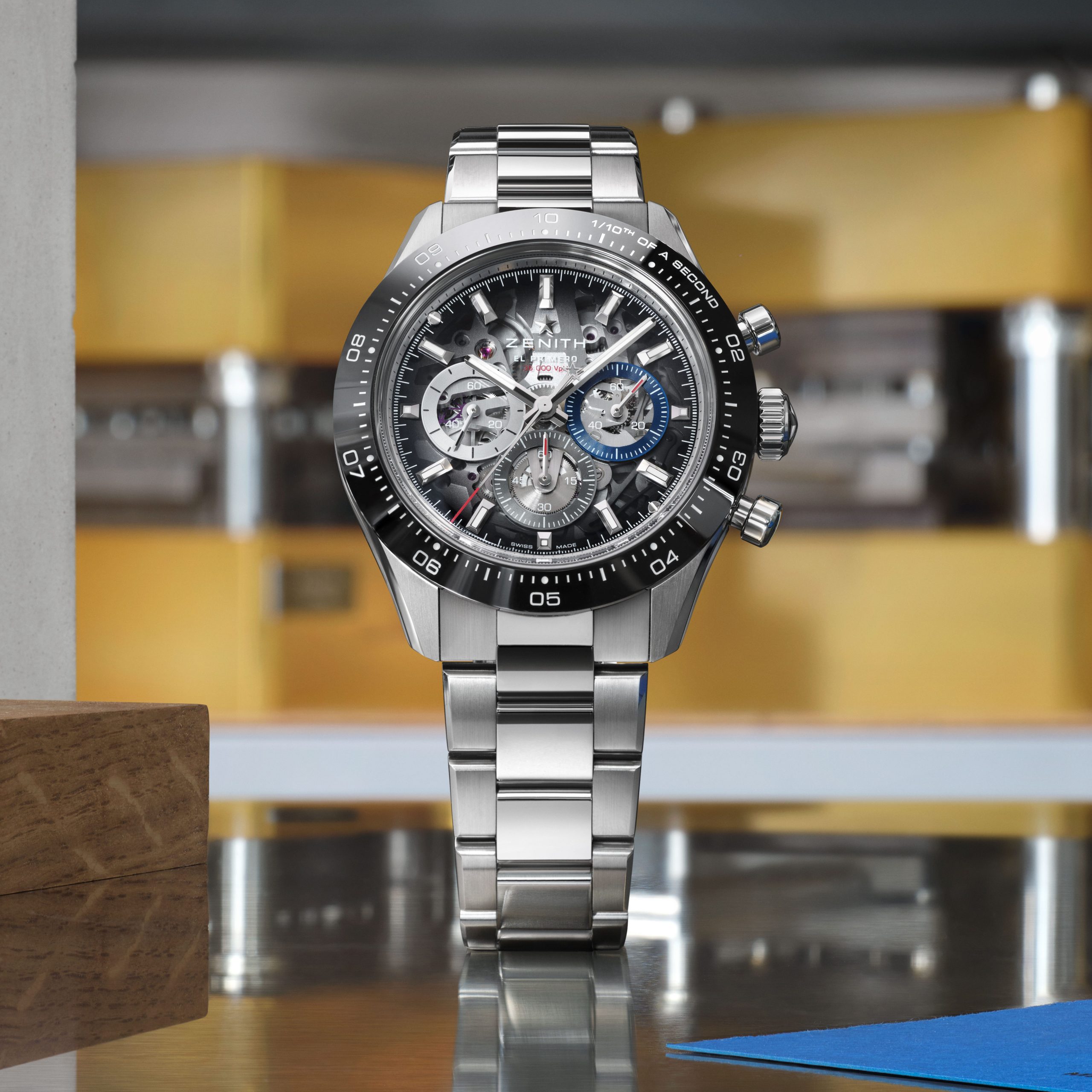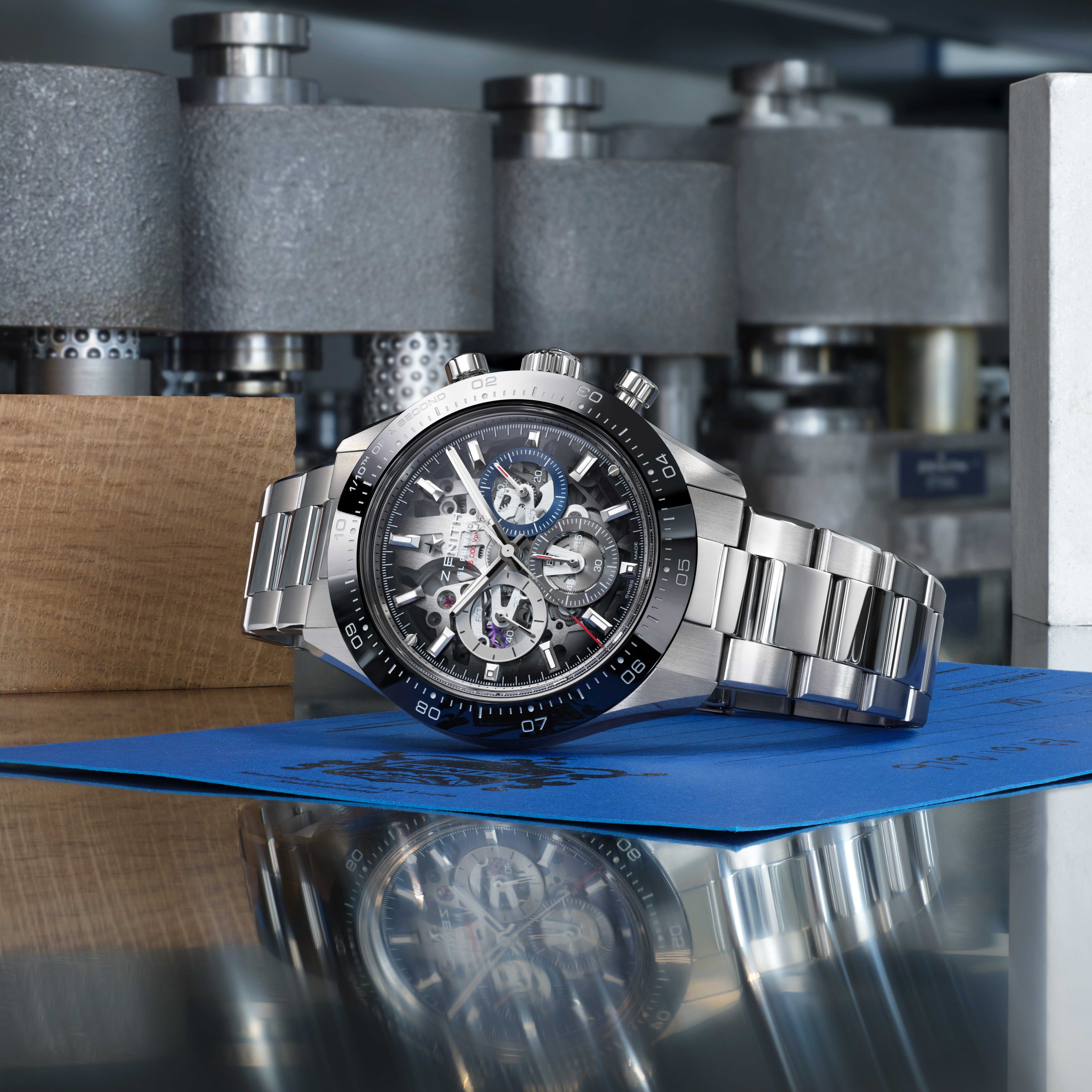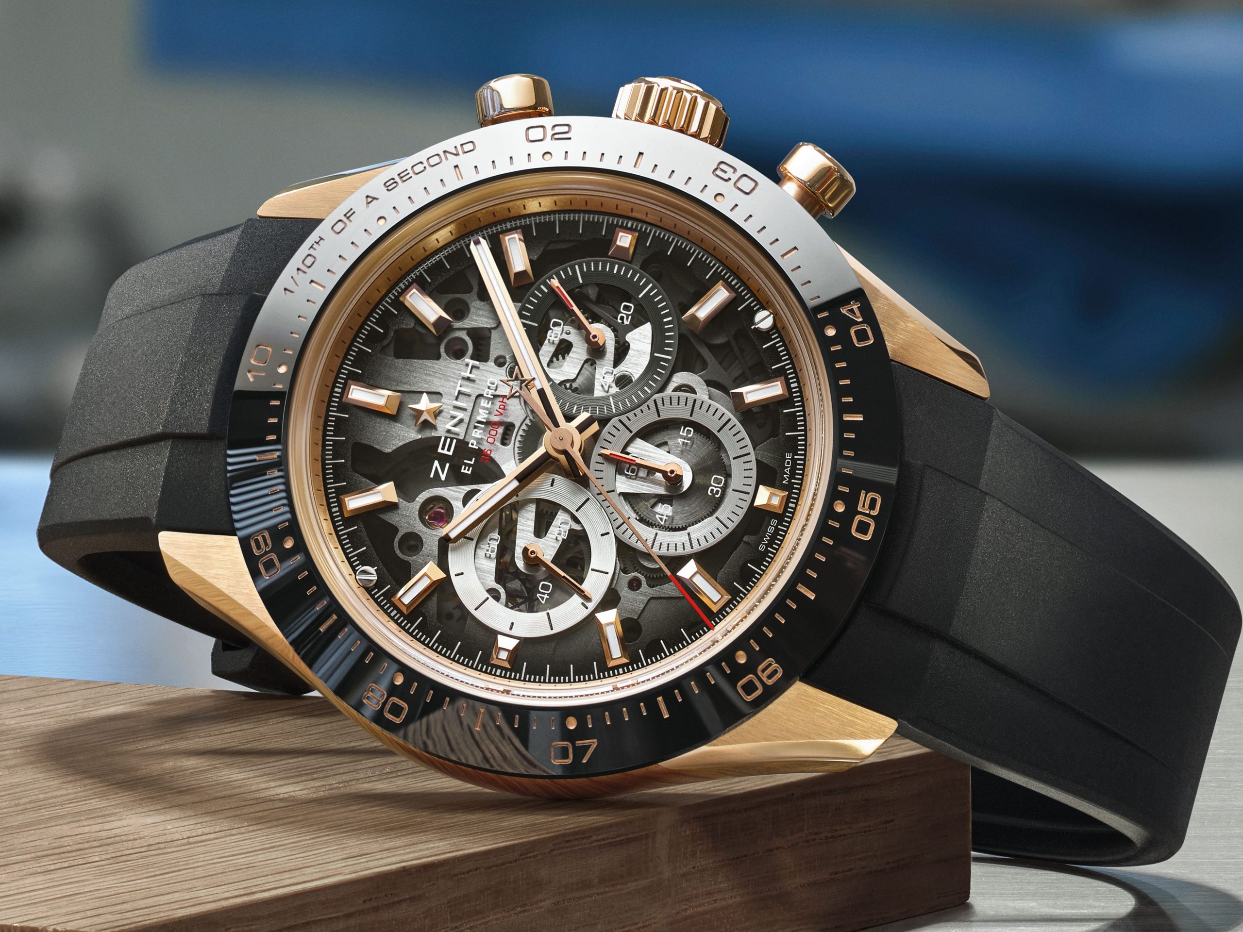 Podbrojčanici ostaju vjerni Zenith tradiciji i dolaze u prepoznatljivoj trobojnoj kombinaciji, sivoj, antracit i plavoj. Dodatno su naglašeni okvirima sa snail završnom obradom, što stvara odličan kontrast u odnosu na transparentni safirni brojčanik. Taj fini kružni uzorak unosi teksturu i dubinu, pa brojčanik djeluje veoma bogato, a pritom ostaje pregledan i sportski. Upravo taj spoj transparentnosti, boje i teksture čini ovaj model jednim od najzanimljivijih Zenith noviteta na sajmu.
